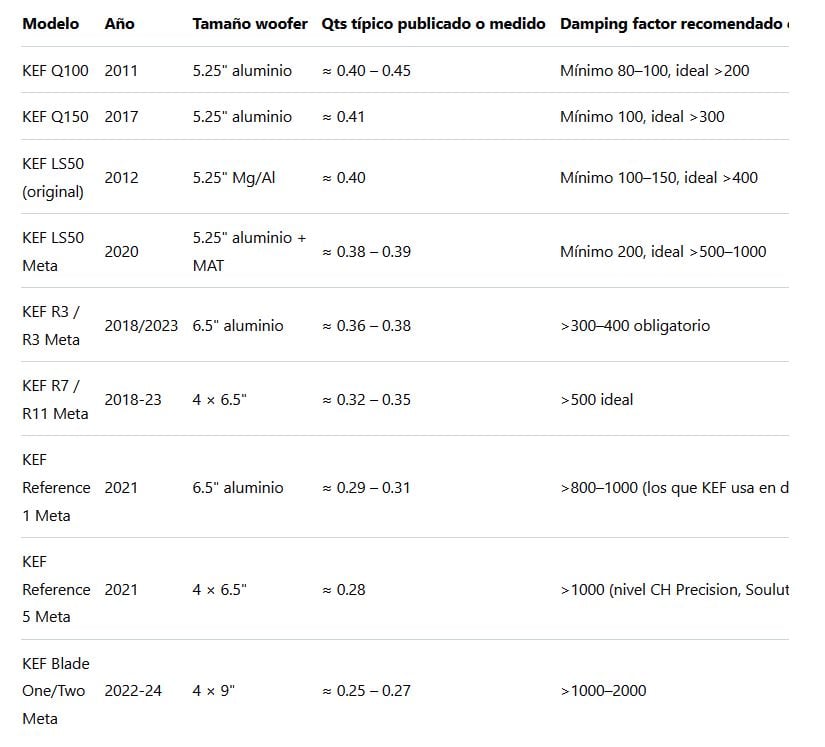 Ejemplos típicos: Magico, Wilson Audio, YG Acoustics, Rockport, JBL M2, KEF Reference/Blade, Focal Utopia/Sopra con woofer de sandwich.Zona intermedia (Qts 0.38–0.5): la mayoría de los alta gama europeos (B&W, Focal Scala, Dynaudio, Sonus Faber, Spendor, etc.) → funcionan bien con damping >100, pero no se caen con 50–80.