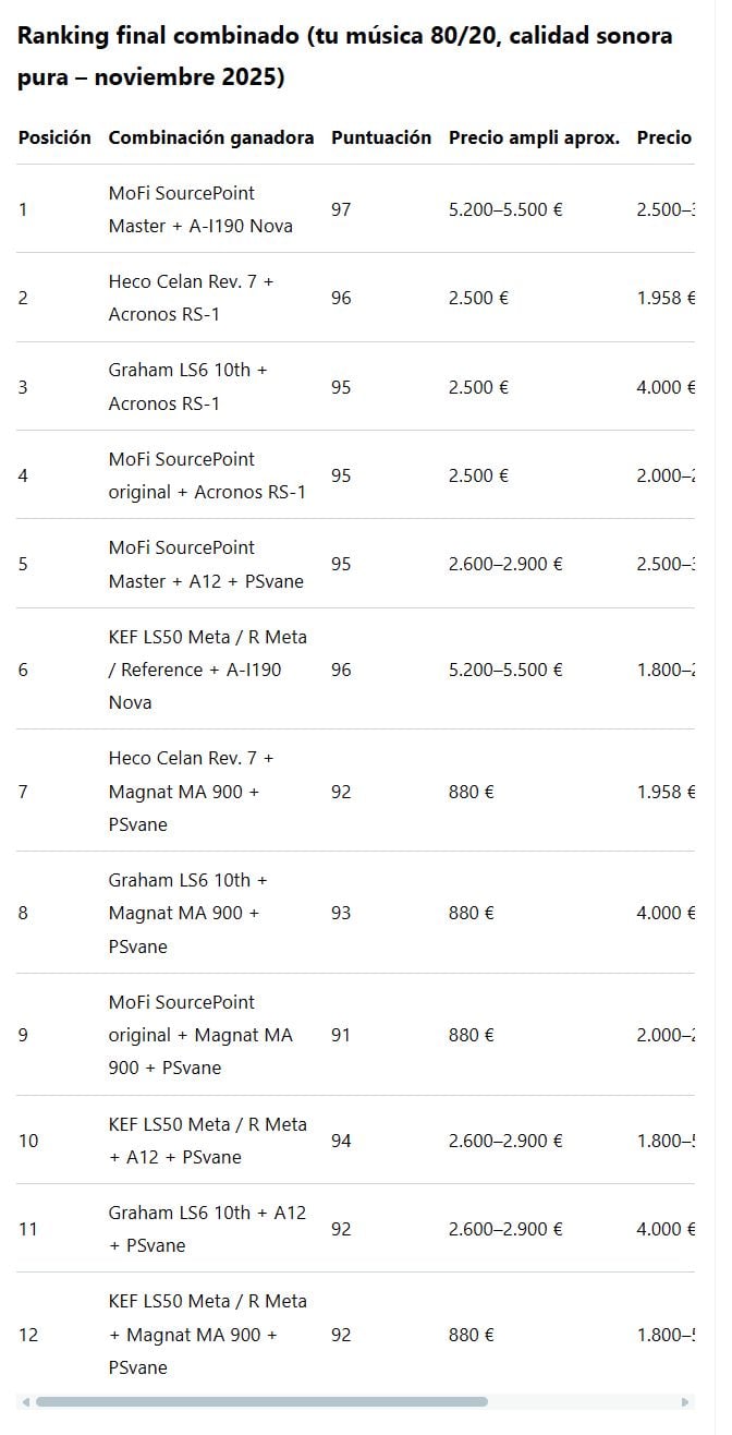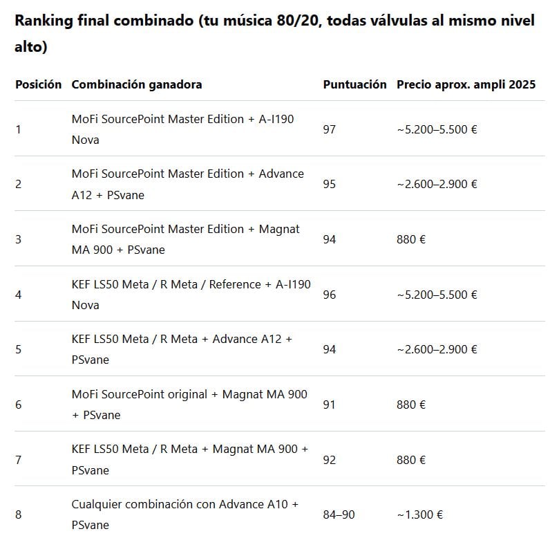En 2025, con perfil 50/50 y sala sin tratar, la combinación MoFi SourcePoint Master Edition + híbrido de alta corriente es la respuesta única y definitiva. Todo lo demás es compromiso en un sentido u otro.