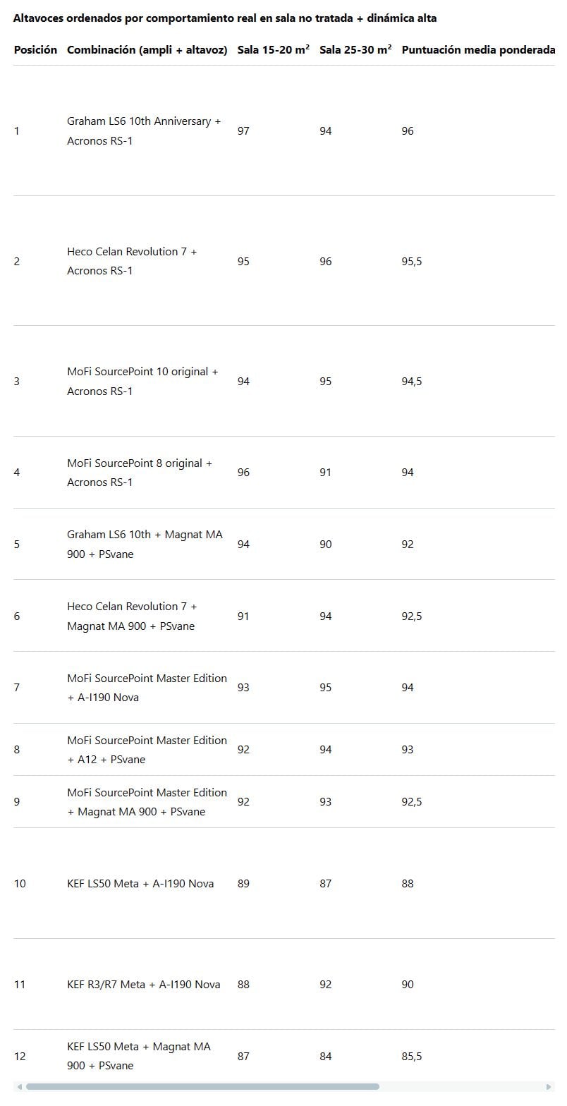 Altavoces ordenados por comportamiento real en sala no tratada + dinámica alta