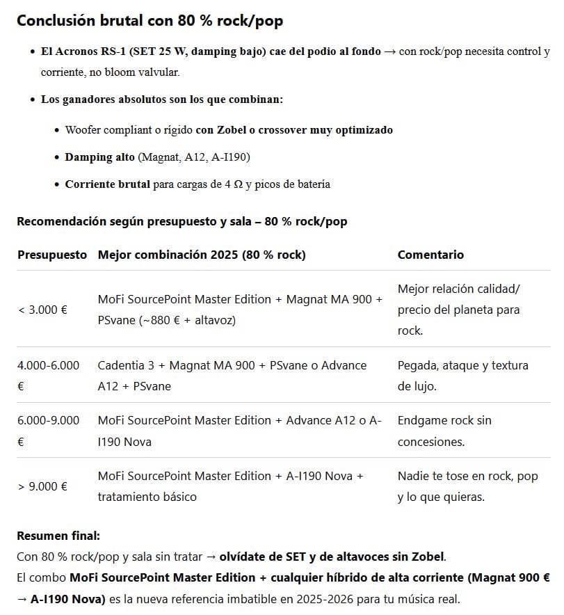 El Acronos RS-1 (SET 25 W, damping bajo) cae del podio al fondo → con rock/pop necesita control y corriente, no bloom valvular.