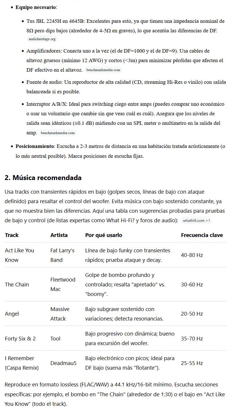 Hola, ya lo encontre estaba perdido en el otro hilo tengo una pregunta para la IA : como se podria hacer una prueba de audio y poder notar las diferencias en cuanto a sonido audible usando diferentes amplificadores con distintas DF, que musica se necesita usar, que volumen y/o potencia se necesita ? tengo disponible unos JBL 2245H en unas cajas 4645B y amplificadores de 1000 DF el mas alto y 9 DF el mas bajo
