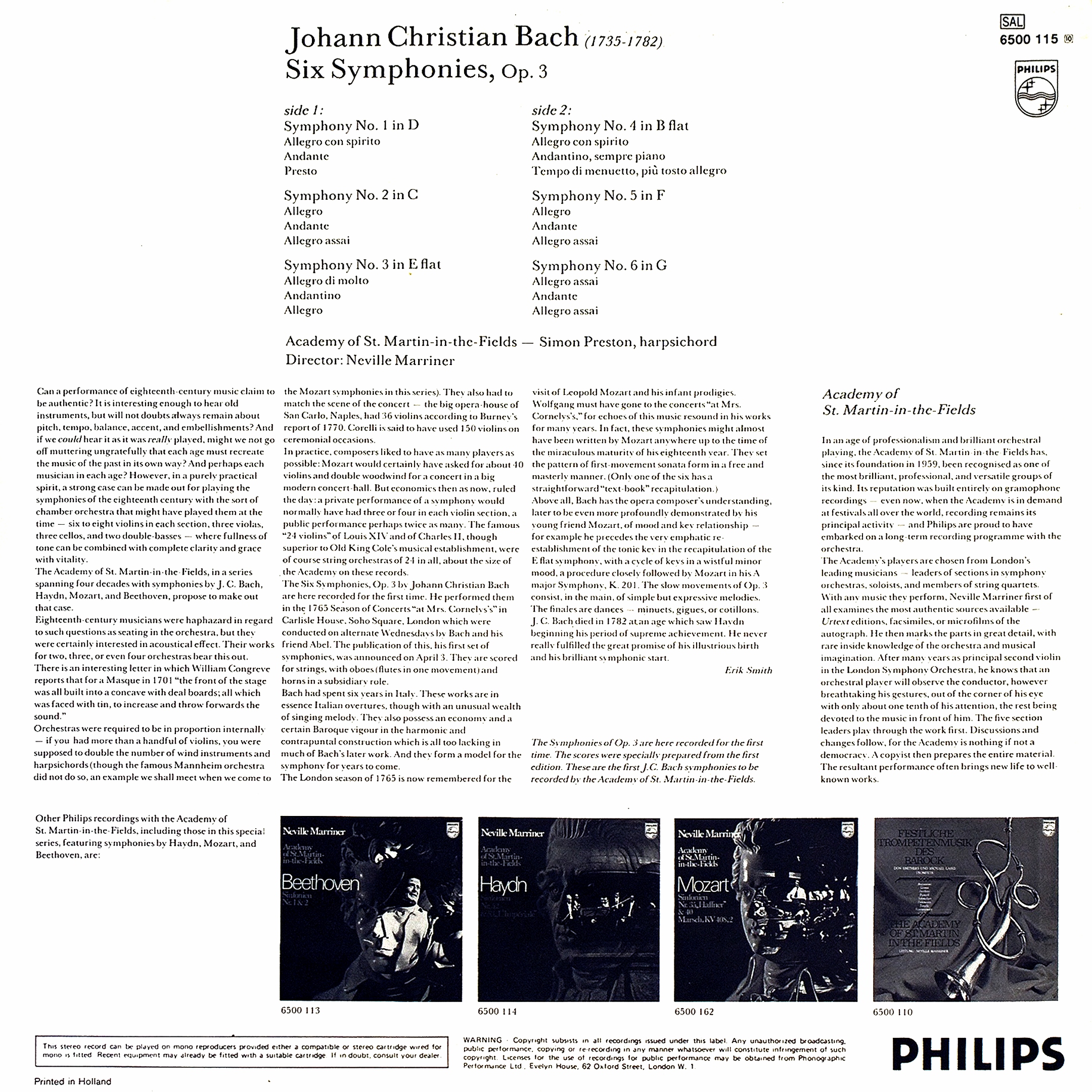 Álbum emblemático de 1970: Six Symphonies, Op. 3 de Johann Christian Bach, interpretado por la Academy of St. Martin-in-the-Fields bajo la dirección de Neville Marriner, editado por Philips en los Países Bajos.