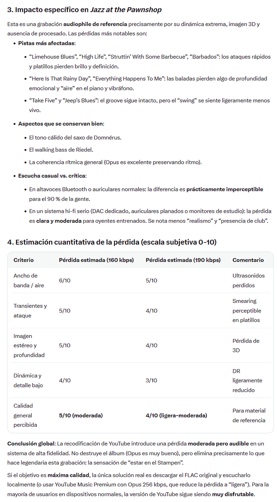 [Grok, Experto] Estima la PÉRDIDA DE CALIDAD SONORA en el álbum anterior (subido como FLAC 24/96 y 4K) por la recodificación a OPUS 160 o 190 que realiza YouTube. Respuesta muy detallada y estructurada.