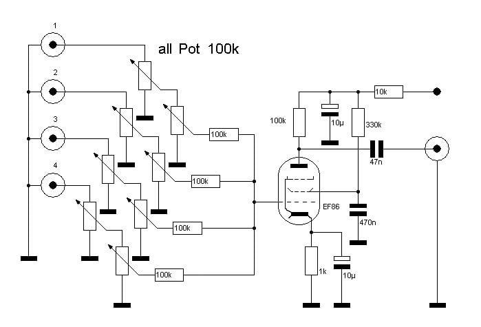 Hice un diseño de circuito Preamplificador Mezclador de línea con una EF86, pentodo de señal, muy utilizado por los fabricantes referencia en Europa: Telefunken, Siemens, Philips, Mullard, etc. Con cualquiera de ellos, la calidad está asegurada, si nos los podemos permitir. Son muy buscados y cotizados en el mercado actual.