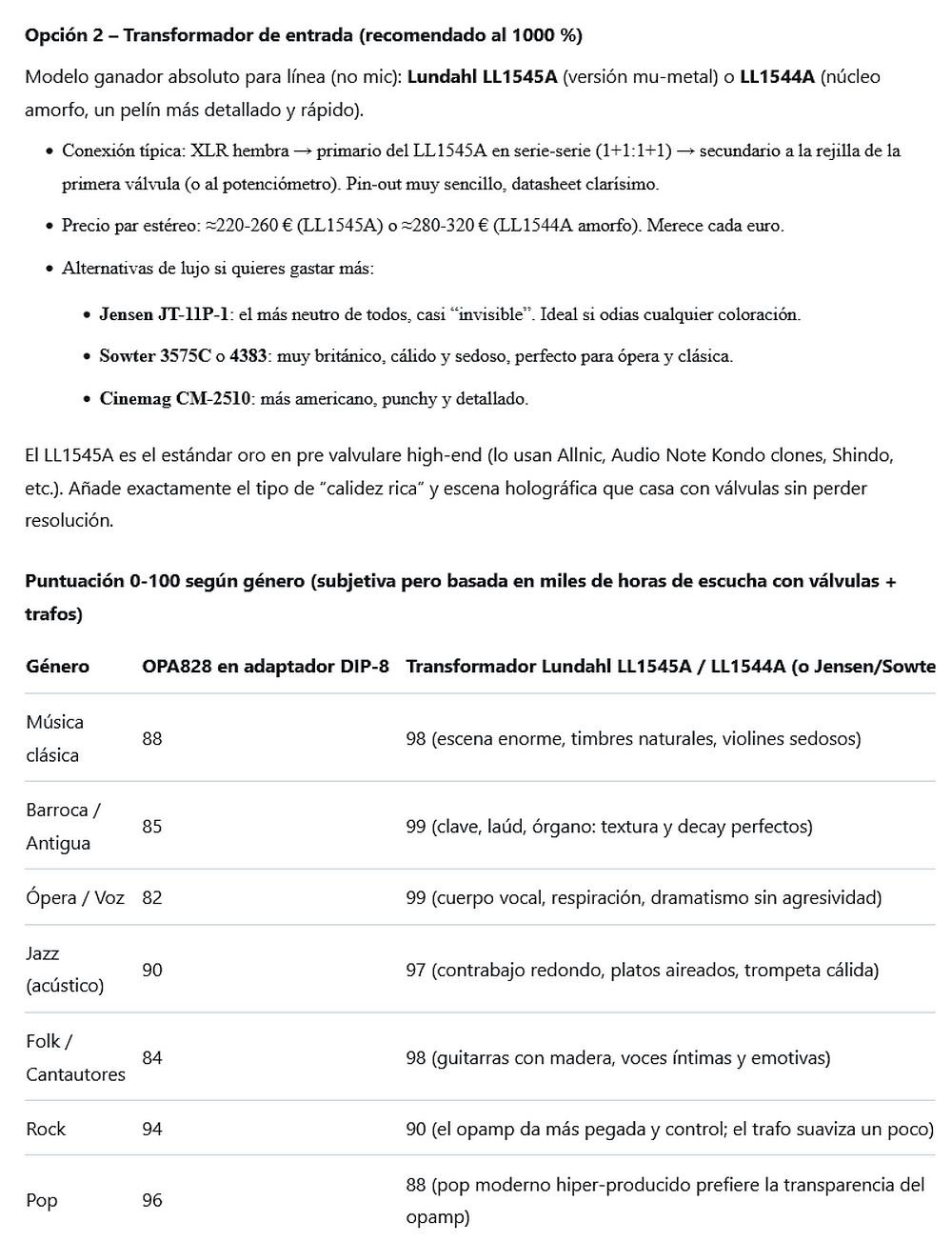 + Imaginemos soy némesis catalana de Juan Calatayud (JC Valvular) y quiero añadir una entrada balanceada XLR a un preamplificador valvular. ¿Qué recomiendas? OPA828 en un pequeño PCB para zócalo (intercambiable) o un autotransformador LUNDAHL