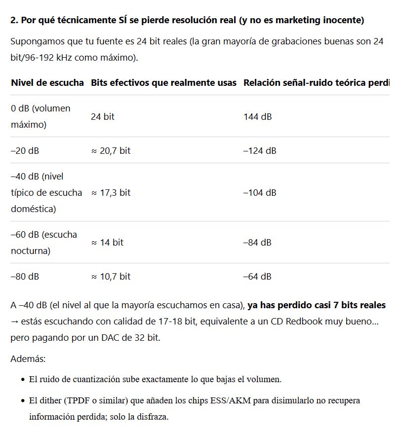 Está integrada gratis en casi todos los chips DAC modernos (ESS, AKM). Técnicamente reduce la resolución real cuando bajas el volumen (pierdes bits). Suena peor que una regulación analógica bien hecha (potenciómetro Alps azul o atenuador por relés). Los fabricantes la promocionan para vender “DAC directo a etapa de potencia”, pero el resultado suele ser claramente inferior a usar un buen preamplificador analógico".