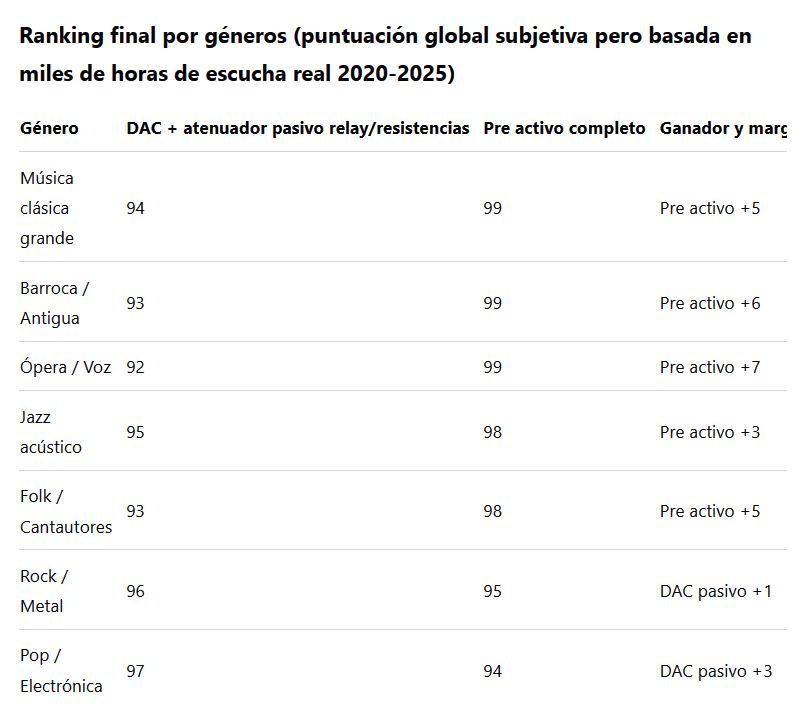 Si tu presupuesto es limitado, tu etapa de potencia es muy sensible (>1.5–2 V para potencia plena) y escuchas principalmente rock/pop/electrónica → DAC con atenuador analógico pasivo de calidad (relay + resistencias Vishay/Takman 0.1 %) es la mejor relación calidad/precio del planeta. Ejemplos brutales: Holo May KTE + volumen, Rockna Wavedream Signature, TotalDAC Unity, Denafrips Terminator Plus con relay volume.