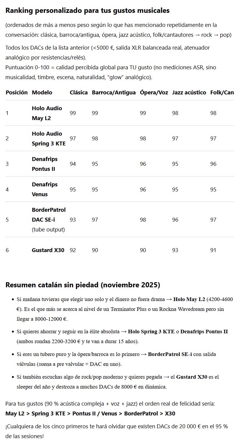 [Grok 4.1] Lista DACs (sean tecnología R2R, FPGA o chip) con verdadera salidas balanceadas y atenuador analógico con resistores, por < 5.000€, tiendas europeas + Para mis gustos musicales, ranking...