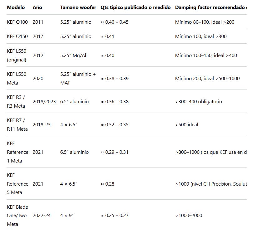 Ejemplos típicos: Magico, Wilson Audio, YG Acoustics, Rockport, JBL M2, KEF Reference/Blade, Focal Utopia/Sopra con woofer de sandwich.Zona intermedia (Qts 0.38–0.5): la mayoría de los alta gama europeos (B&W, Focal Scala, Dynaudio, Sonus Faber, Spendor, etc.) → funcionan bien con damping >100, pero no se caen con 50–80.