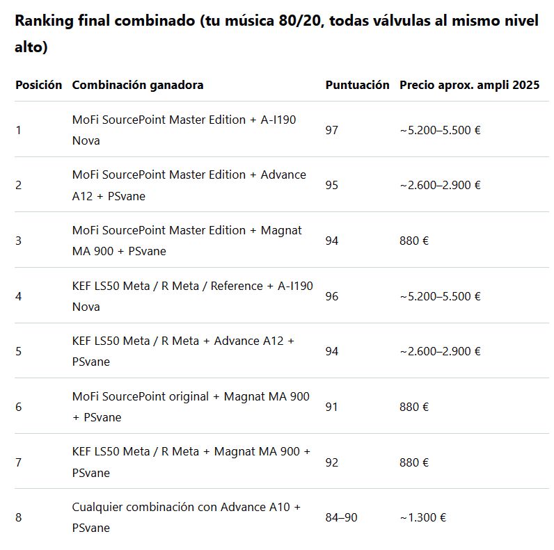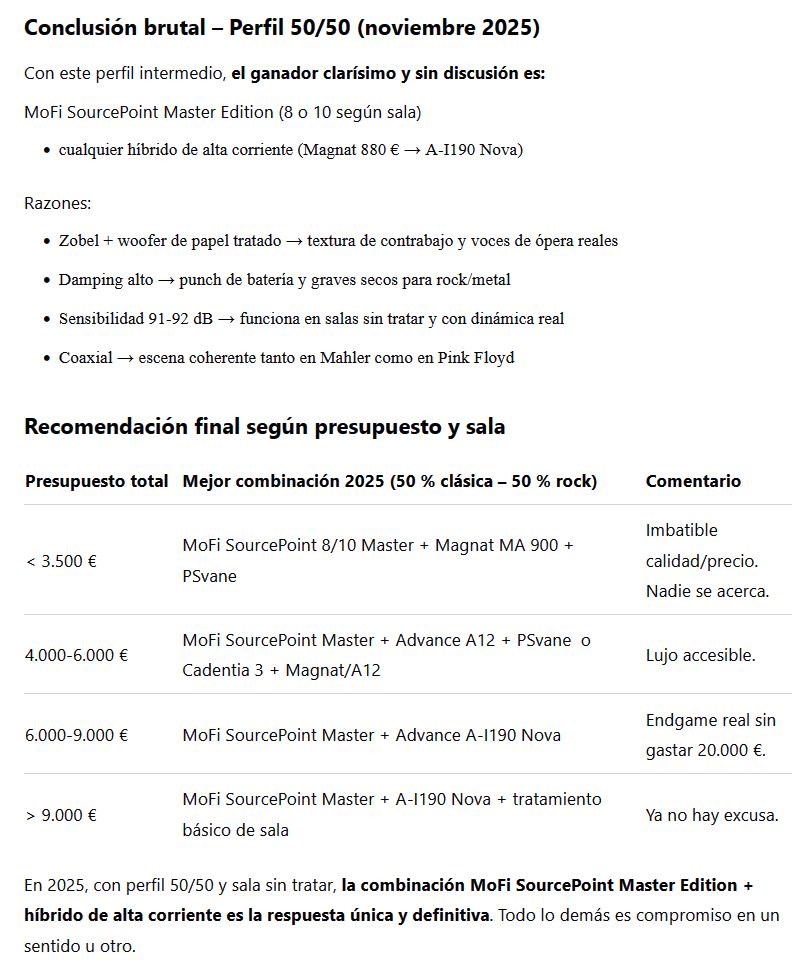 En 2025, con perfil 50/50 y sala sin tratar, la combinación MoFi SourcePoint Master Edition + híbrido de alta corriente es la respuesta única y definitiva. Todo lo demás es compromiso en un sentido u otro.