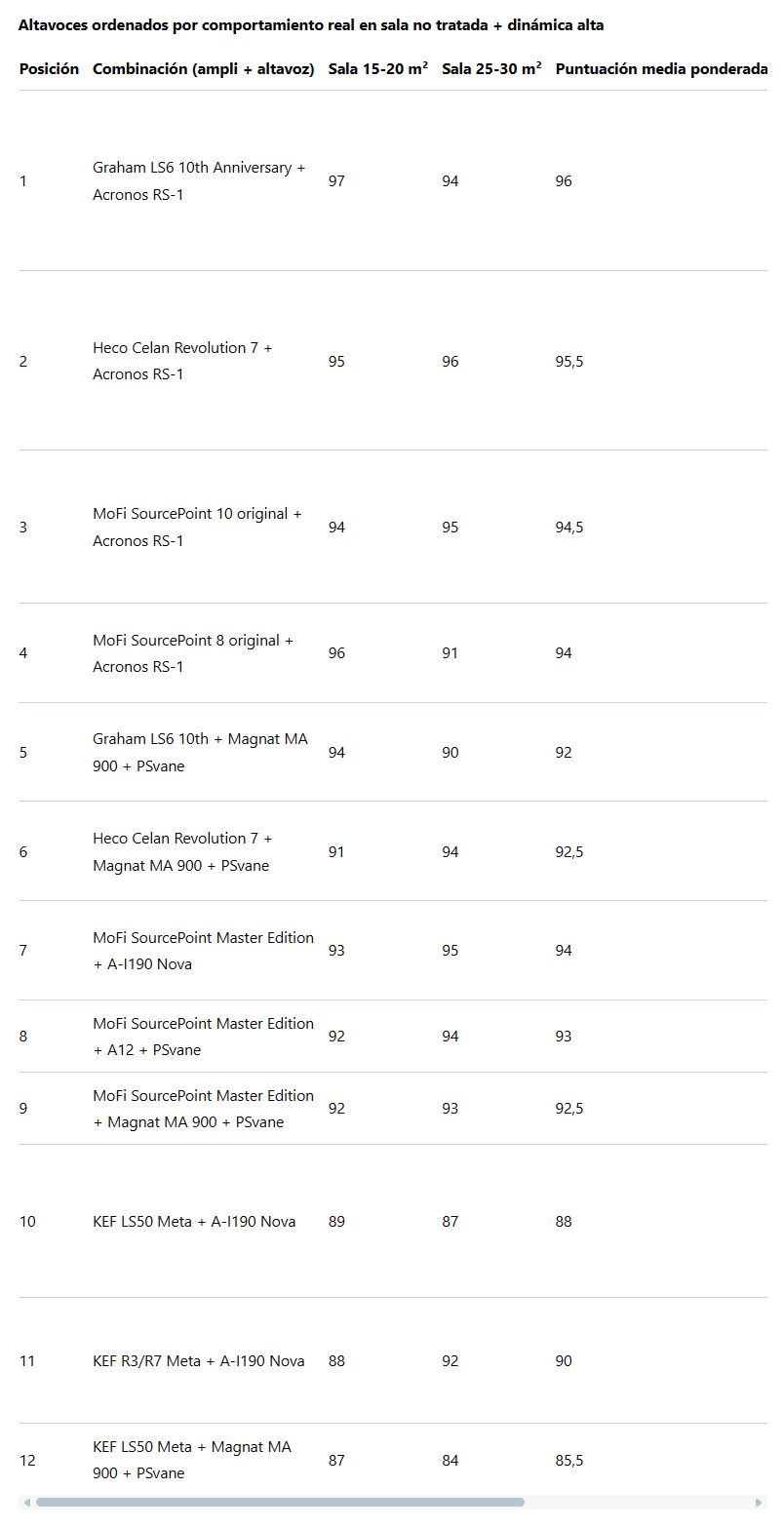 Altavoces ordenados por comportamiento real en sala no tratada + dinámica alta