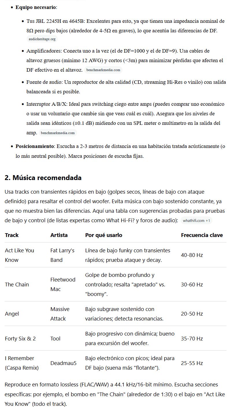 Hola, ya lo encontre estaba perdido en el otro hilo tengo una pregunta para la IA : como se podria hacer una prueba de audio y poder notar las diferencias en cuanto a sonido audible usando diferentes amplificadores con distintas DF, que musica se necesita usar, que volumen y/o potencia se necesita ? tengo disponible unos JBL 2245H en unas cajas 4645B y amplificadores de 1000 DF el mas alto y 9 DF el mas bajo