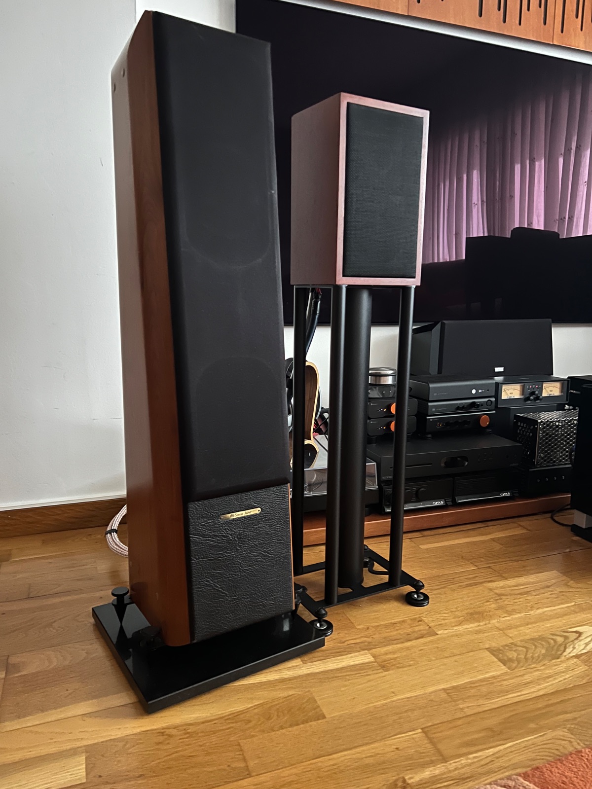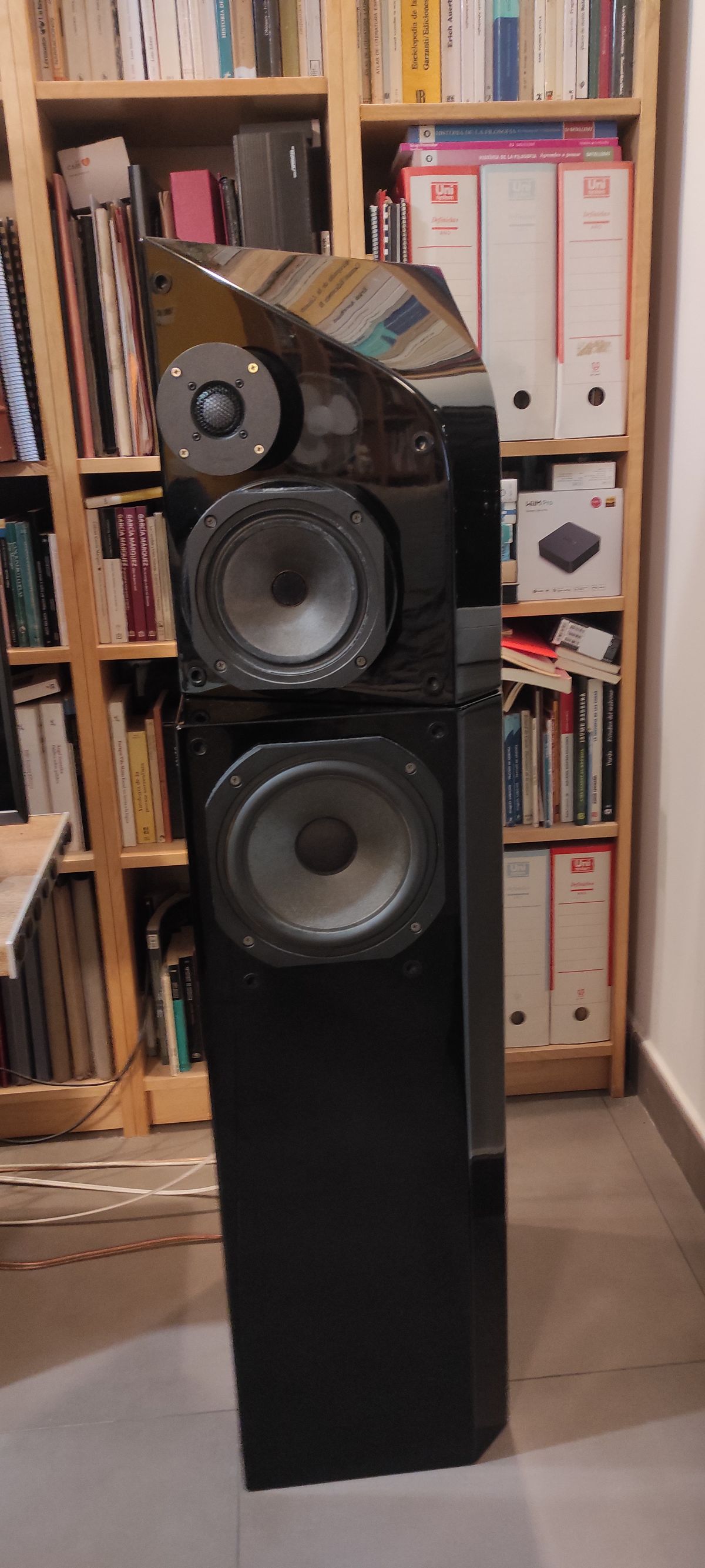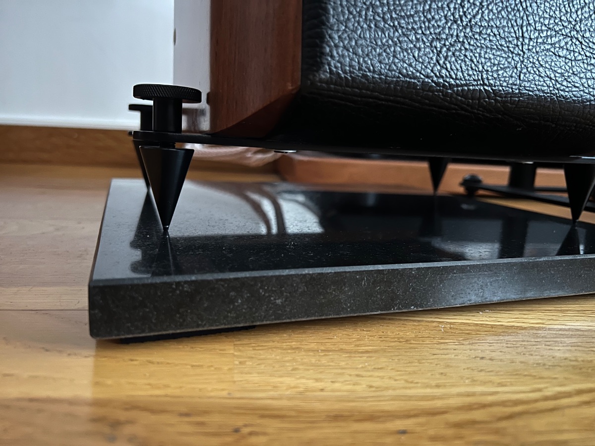 Hoy he añadido unas bases de granito a las Sonus Faber con pads de caucho de alta densidad de 10mm en la parte inferior. Curiosamente los spikes no desacoplan, justo lo que hacen es acoplar y lo que tiene debajo es lo que realizaría el desacoplo.