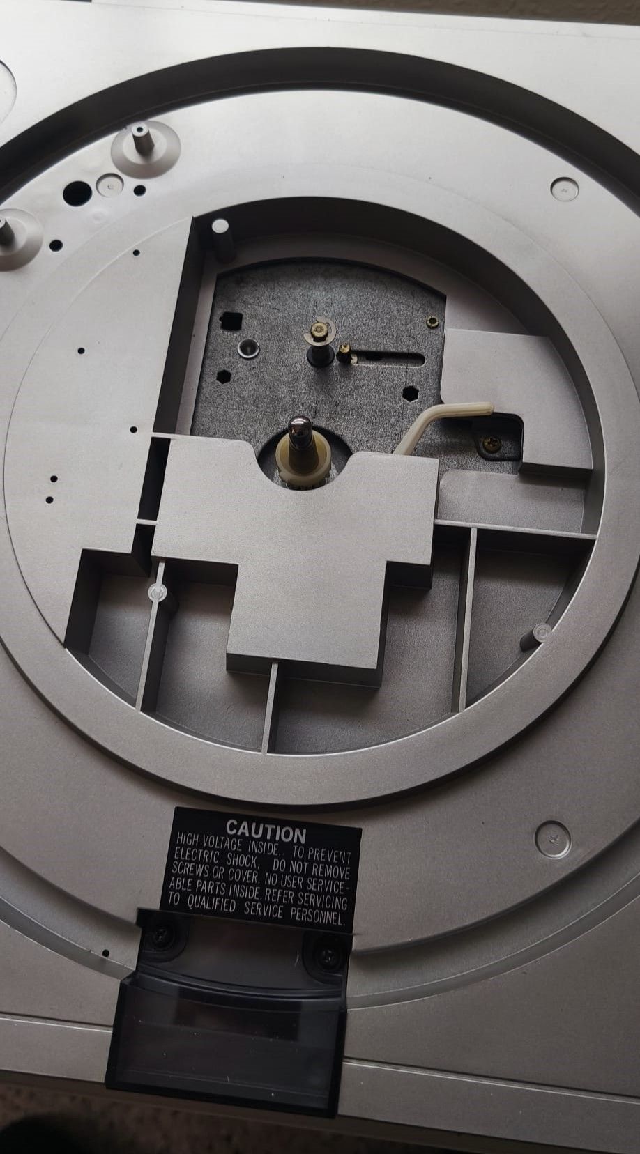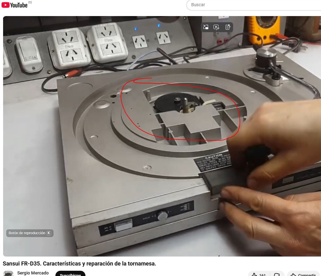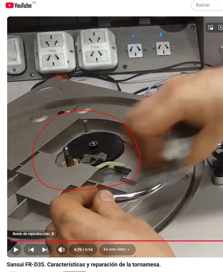 Buenos días. Lo siento, sigo dando la lata con mi tocadiscos Sansui FR-D35. Me llamaba la atención que, según las instrucciones, el tocadiscos tenía retorno automático al acabar de reproducir el disco y que, incluso, pulsando el botón de stop se podía retornar antes. Siguiendo los consejos de Maty (¡muchas gracias!), busqué el vídeo de youtube en el que se restaura un modelo igual de tocadiscos, haciéndole una revisión y limpieza a fondo. Así me di cuenta que falta alguna parte que indico en las imágenes (marcado con línea roja) y que en mi tocadiscos (primera imagen) parece que falta. Por ello, lógicamente, aunque pulse el botón y se accione la palanca blanca, el brazo no vuelvo a su sitio por falta la rueda negra y posiblemente otras piezas. El caso es que ha consultado con mi suegro, quien compró el tocadiscos nuevo en su día y lo tenia guardado y que me ha confirmado que nunca desmontó ni modificó parte alguna del aparato. En el caso de que realmente falten piezas, ¿hay alguna manera de conseguir recambios? El tocadiscos funciona perfectamente, a falta de esta función de autoreturn. Lo único es que tengo que poner y quitar el brazo manualmente cuando quiero escuchar un disco.