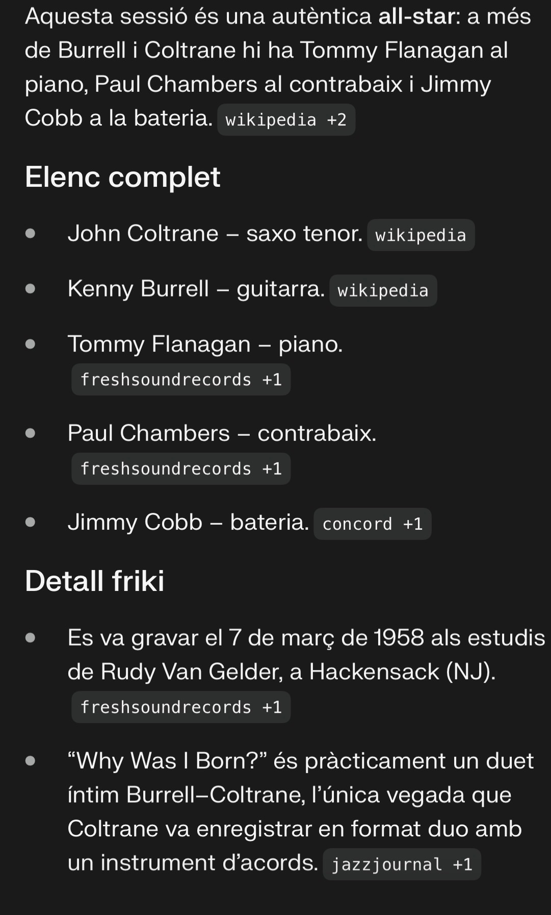 Los dos pianistas son de lujo: Mal Waldron (más oscuro y angular) en la primera sesión y Red Garland (más lírico y “block chords”) en la segunda. Se nota la diferencia de enfoque.