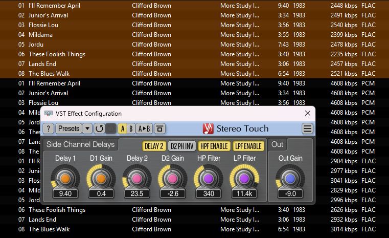 Pseudo-estéreo (tu versión procesada): Mejora la espacialidad —piano con más "presencia" (como pediste a Grok), trompeta menos dominante. Usando Stereo Touch (width ~50-70%, delay sutil), los instrumentos "respiran" mejor: solo de Brown en "Mildama" (DR11) se siente envolvente. En YouTube, el AAC capta ~80% de la dinámica FLAC, pero pierde microdetalles (e.g., decay de platillo). Calidad general: 9/10 para un ripeo casero; el ruido de vinilo es mínimo, y el balance es excelente para streaming.